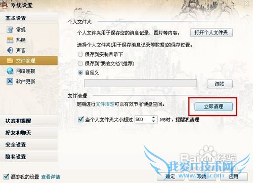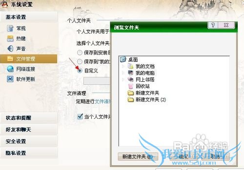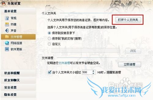 个人文件夹存放地。如果不想将消息记录、图片等内容存放在安装目录下,可以选择存放在保存到“我的文档”下,或者也可以选择自定义