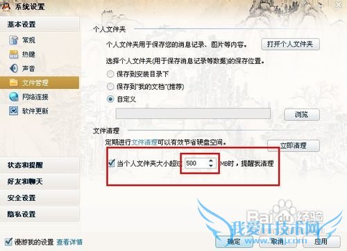 如果天天清理qq接收的文件,那样的话,就太麻烦了。我们可以进行以下操作,在文件清理下选择“当个人文件夹大小超过多少MB时,提醒我清理”。设置好之后,一定要点击确定哦。