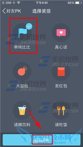 3)接着选择奖惩类型。点击【发起PK】。对方将接收到挑战信息。(如下图)