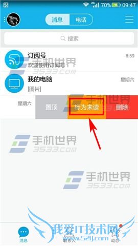 2)然后在横拉出的选项中点击【标记未读】就可以了。(如下图)