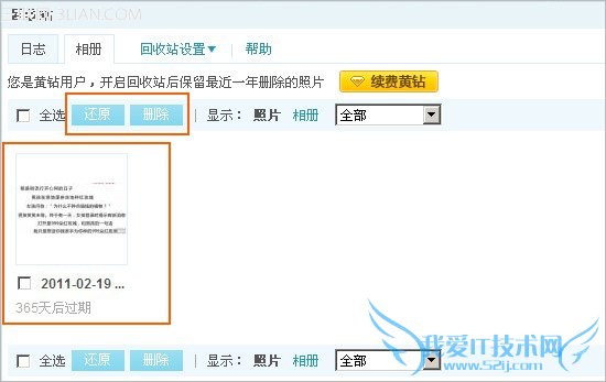 4、删除后的照片在日志、动感影集等处的引用马上会失效,照片恢复后在日志动感影集等处的引用将重新生效;