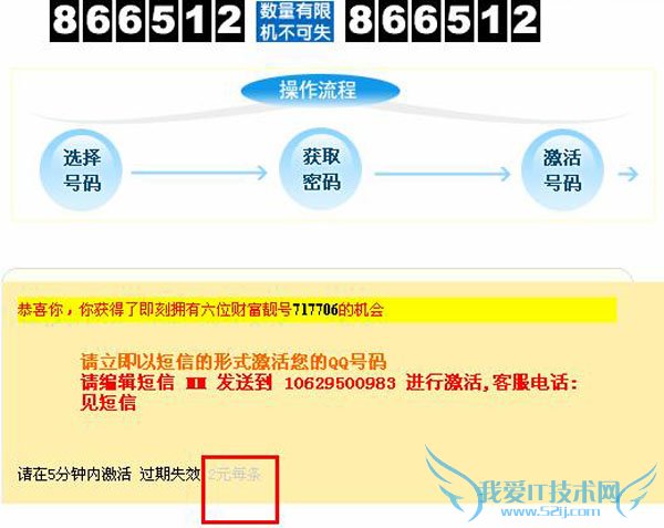 请注意,这里的 短信资费是2元/条 ,这才是诈骗者骗取钱财的最终目的。当然,即使访问者立即发送短信“激活”所谓的靓号,也无法收到QQ靓号和任何答复,手机话费就这样轻易落入了诈骗者的口袋里.