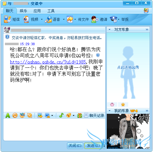 如果你在QQ上收到陌生网友发来的免费抢QQ靓号、Q币的“喜讯”,请警惕,因为这是流行的骗术手段之一。腾讯公司不会和第三方组织或个人开展“免费送5、6位QQ号码”活动。下面的骗术就是以提供“免费5、6位QQ号码”做幌子,当用户选择一个QQ号码时,会要求用户使用手机激活QQ号码以骗取高额电话费。