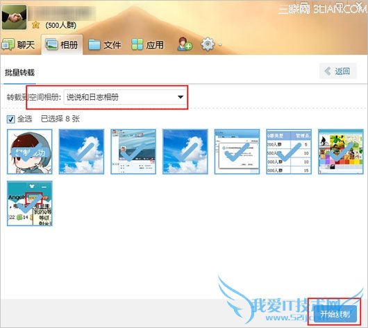 第三步:选择您要将群相册的相片转载到QQ空间哪个相册中=》选择要转载的相片(可全选或手动一张一张的选择)=》点击右下角的“开始复制”=》复制成功,登录到QQ空间相册中可查看到刚刚复制成功的相片。
