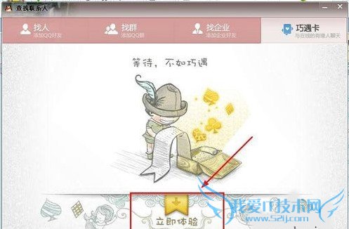 【2】在查找联系人对话框中,我们切换到【巧遇卡】选项,然后点击下面的立即体验