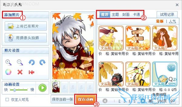 2、您可以添加一张您喜欢的图片,添加完后您可以从“主题、封面、卡通”中挑选您喜欢的照片相框,完成后,点击“保存当前一张”或“保存动画”;