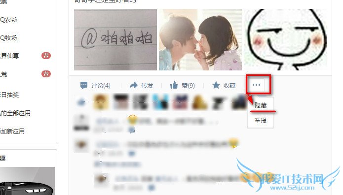 8:如果你好友多,一个一个去找比较麻烦。那就使用方法三。在QQ动态中看到想屏蔽某人的,点击ta收藏右边“...”选择隐藏即可。