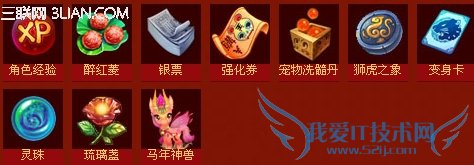 角色经验、醉红菱、银票、强化券、宠物洗髓丹、狮虎之象、变身卡、灵珠、琉璃盏、神兽