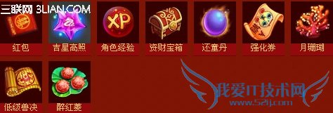 红包、吉星高照、角色经验、资财宝箱、还童丹、强化券、月珊瑚、低级兽诀、醉红菱