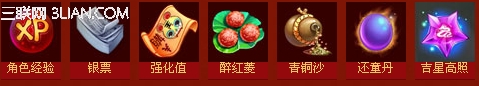 角色经验、银票、强化值、醉红菱、青铜沙、还童丹、吉星高照