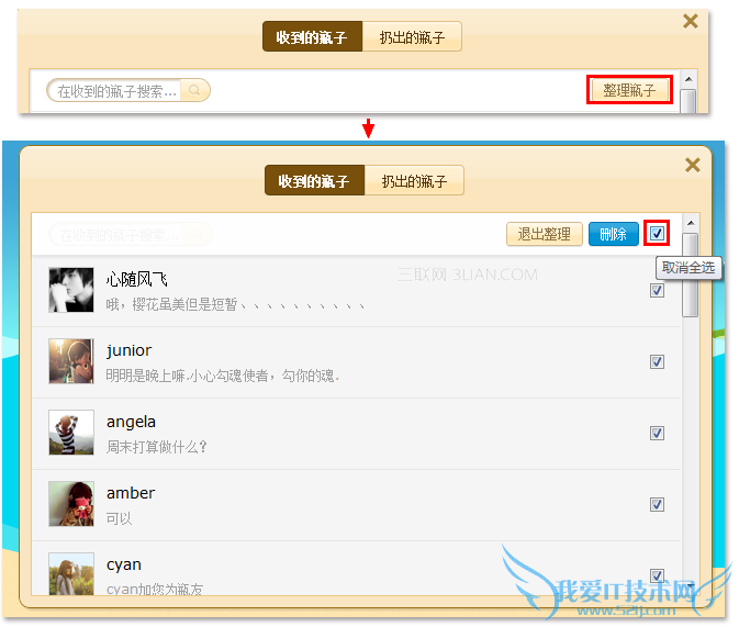 进入[我的瓶子]-[收到的瓶子]/[扔出的瓶子]列表,将列表的滚动条拉到最顶部,点击”整理瓶子“,选择”全选删除“,确定后即可删除当前页上的所有瓶子。
