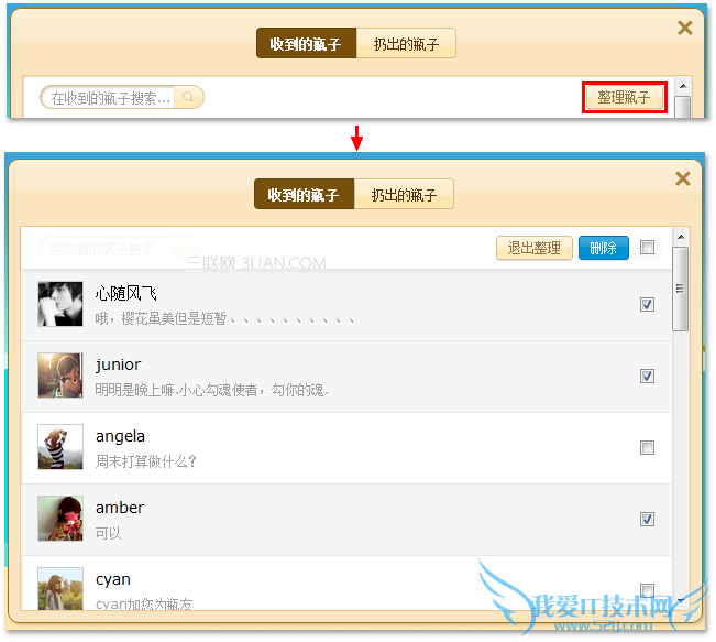 进入[我的瓶子]-[收到的瓶子]/[扔出的瓶子]列表,将列表的滚动条拉到最顶部,点击”整理瓶子“。选出你想要删除瓶子,确定后即可删除。