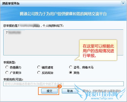 2、将弹出“腾讯举报平台”对话框,您可以在对应举报类别中选择涉及到不良信息的内容。还可以举报说明其它非法内容,最后点击“提交”;