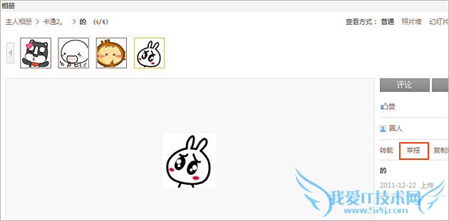 若他人QQ空间相册涉及到上传不良图片(如:反动、色情,欺诈、盗号等),您可以进入他人相册,打开不良图片后,在页面右边点击“举报”按钮,如图: