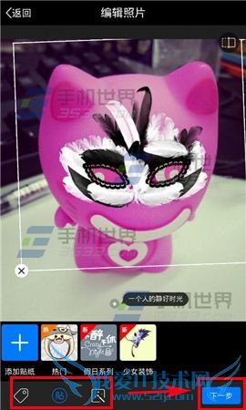 3)点击左下角三个小图标分别对照片进行添加贴纸、标签、滤镜。编辑完成后点击【下一步】,编辑说说内容后点击右上角【发表】即可。(如下图)