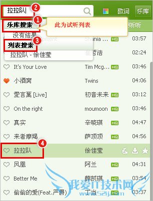 在试听列表中搜索歌曲,需要先点击“试听列表”,然后在搜索中输入歌曲名称,点击“列表搜索”即可。如下图:
