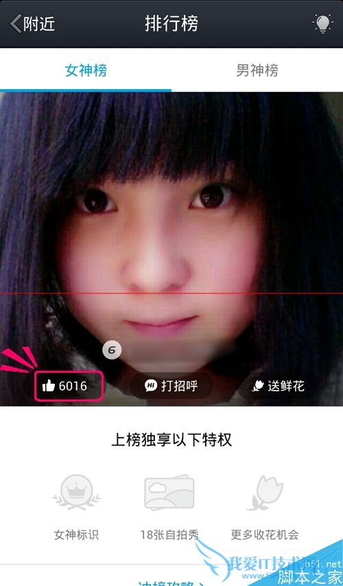 5、哪我怎么给心仪的女神投票点赞给予支持呢?点击[排行榜]上面的任何一位女生打开排名,会显示当前最靠前的五位女神。你可能要做的事不用很多,静静地点击左边的[大拇指]给别人投票点赞就够了