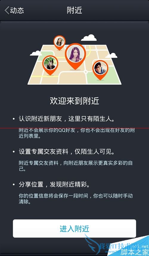 3、首次进入QQ附近会显示一个示例消息,看完直接点击[进入附近]
