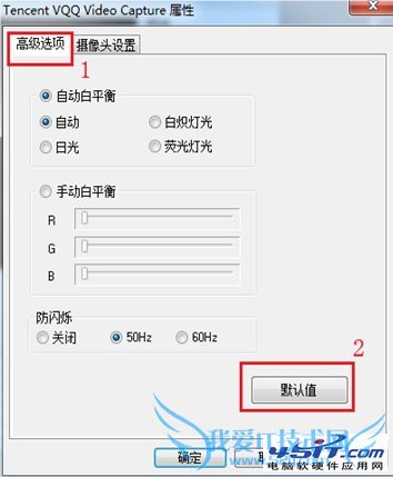 4、在弹出的“Tencent VQQ Video Capture属性 ”对话框“高级选项 ”选项卡中,点击“默认值 ”回到默认设置。