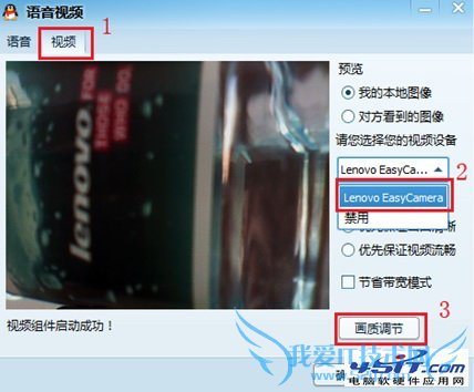 2、在弹出的“语音视频 ”对话框“视频 ”选项卡中,选择“Lenovo EasyCamera ”(机型不同显示会有所不同),此时可以看到预览,然后点击“画质调节 ”按钮;