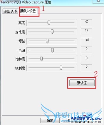 3、在弹出的“Tencent VQQ Video Capture属性 ”对话框“摄像头设置 ”选项卡中,点击“默认值 ”回到默认设置;