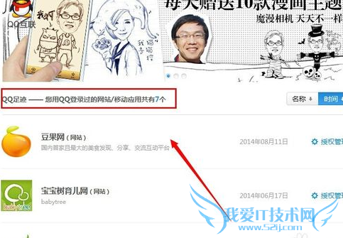 5、点击qq足迹进入页面,在这里就可以看到您使用qq登录过哪些网站或者应用,分别是哪些?什么时候授权的,同时还可以进行授权管理。