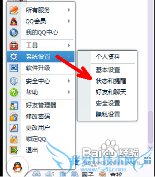 在弹出菜单中点击系统设置选项,然后会弹出一系列的次级菜单,点击状态和提醒选项。