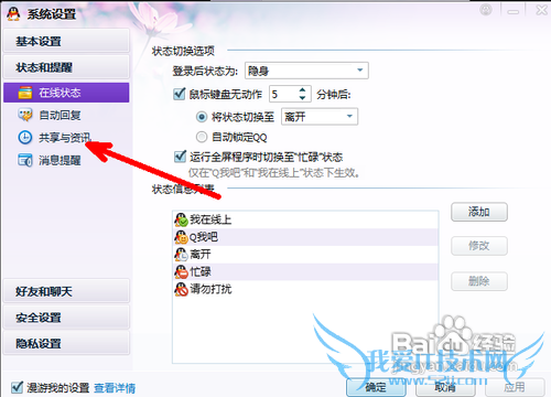 在系统设置状态和提醒选项中,点击左边栏中的共享与资讯,如图所示。