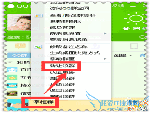 点你要解散的QQ群——掌柜群,打开转让该群(这里有人会问,你不是要解散群,为何要进入这里呢?因QQ界面这里没有解散群进入口,只能借助它进入解散群处,明白了吧)