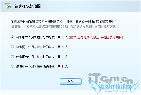 如果你想恢复QQ好友,单击相应的选项系a统就会跳和恢复范围选择,在这里普通用户最多可以恢复3个月内被删除的好友,QQ会员最多可以恢复6个月内被删除的好友。