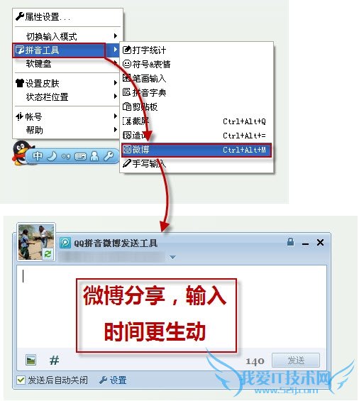 在QQ输入法输入状态下,右击语言栏,在弹出菜单中选择“拼音工具”中的“微博”选项,就会弹出微博窗口,输入想要分享的文字,即可实现微博分享功能。