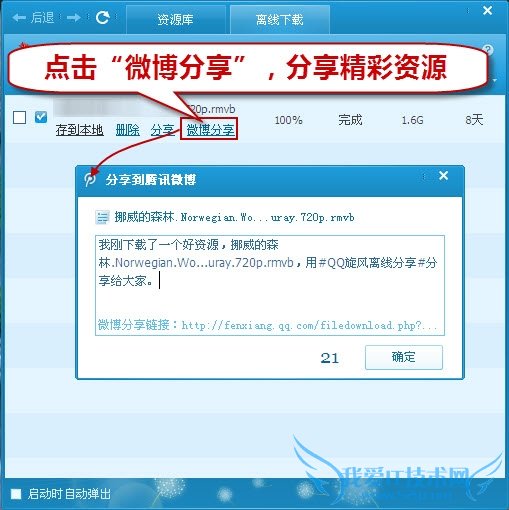 用户登录QQ旋风后,可以在“资源库”的“离线下载”中打开离线空间,选择好的资源通过“微博分享”一键分享至腾讯微博,用户也可在腾讯微博搜索话题#QQ旋风离线分享# ,让腾讯微博好友也可以快速、便捷地获取优质资源,高效下载,享受高清影视生活。