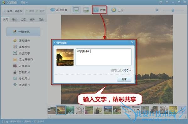登录QQ影像,单击需要分享的图片,在上方的工具栏中选择“广播”按钮,在弹出微博窗口,记下你此刻的所感所思,让好友一起感受这份精彩。
