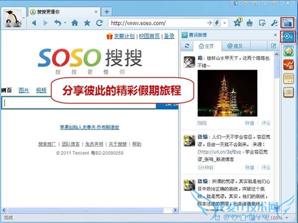 不仅QQ输入法和QQ影像能给用户带来最便捷的腾讯微博分享通道,QQ浏览器侧边栏的微博应用更方便用户快速登录微博,分享假期生活。突出的侧边栏,不妨碍正常的网页浏览,用户浏览网页和实时关注微博两不误!