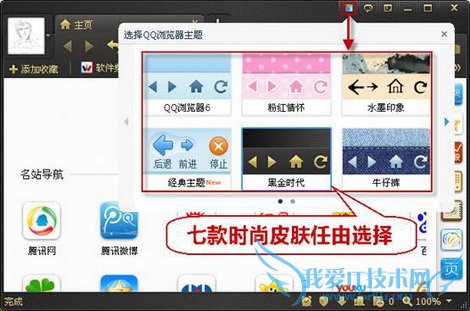 秋日的绚丽色彩让人心情大好,QQ浏览器的炫彩皮肤也为这个秋天增添了几份绚丽的色彩。QQ浏览器为满足用户对个性的追求,打造了7款不同类型的皮肤外观供用户选择。点击QQ浏览器菜单栏“换肤”图标,系统提供了7种主题皮肤,选中任何一款皮肤,点击即可享受与众不同的浏览器界面。(图2)