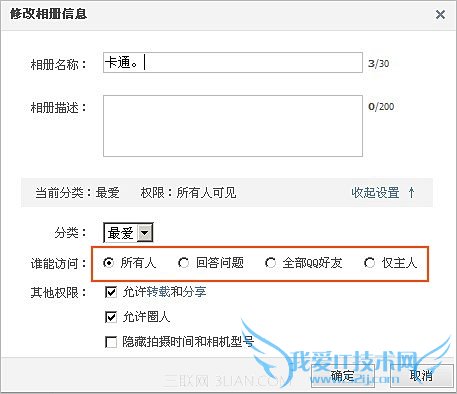 如下图所示,在修改相册信息界面中的“谁能访问”栏目,可以对该相册设置四种访问方式:所有人、回答问题、全部QQ好友和仅主人。