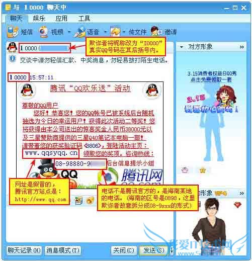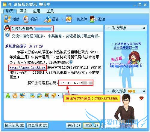 最近一段时间,有不法分子假冒“腾讯公司”名义,通过QQ聊天消息发送虚假的中奖通知信息。大意通常都是用户被系统抽取为某活动中奖幸运用户,想要领奖需要填写个人详细资料及支付相关费用,要求用户按所提示联系方式进行汇款。