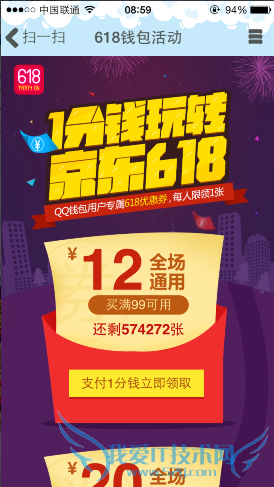 618钱包活动火热来袭!QQ钱包支付1分钱即可100%领618京东券!满99元即可直接抵现12元,或是满178直接抵现20元,这可是QQ钱包用户专属618优惠券哦!每人限领一张,赶紧来参与吧!