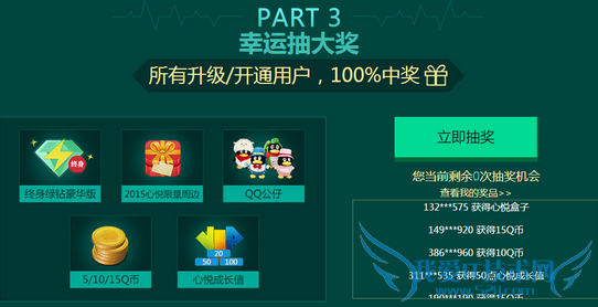 3.凡开通/升级一个月绿钻豪华版的用户,可获得抽奖次数1次,多开多得,100%中奖。奖品包括:Q币,实物周边,心悦成长值,终身绿钻豪华版;