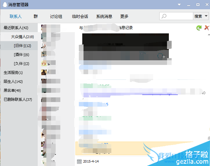 2、到这个界面,我们可以看到“最近联系的人”;但这样找很麻烦,这里是QQ里面所有人的聊天记录。