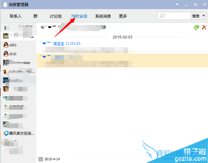 4、点击“临时回话”,这里面的人都是回话过的,但没加好友的,我们可以从旁边的聊天记录轻易找到你想找到的人。