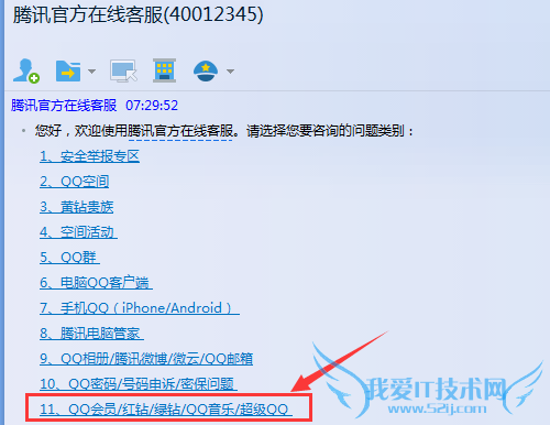 3、电脑QQ会弹出在线客服聊天窗口(400012345),点击第11项 (QQ会员/红钻/绿钻/QQ音乐/超级QQ)