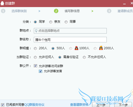 3、选择“群规模:500人,加群验证:允许任何人,群公开:允许游客访问该群、允许游客发言”,然后下一步。如下图,