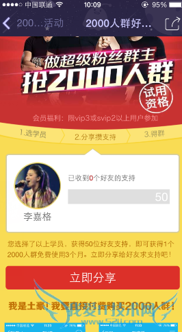2、支持自己喜爱的成员以后,点击立即分享,如果获得50位好友支持,即可获得1个2000人群免费使用3个月哦!