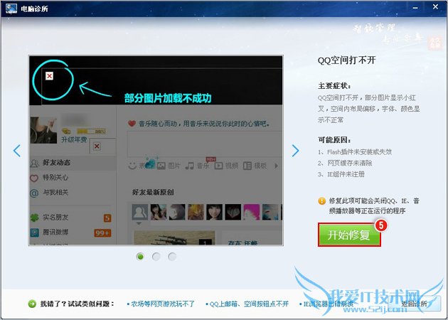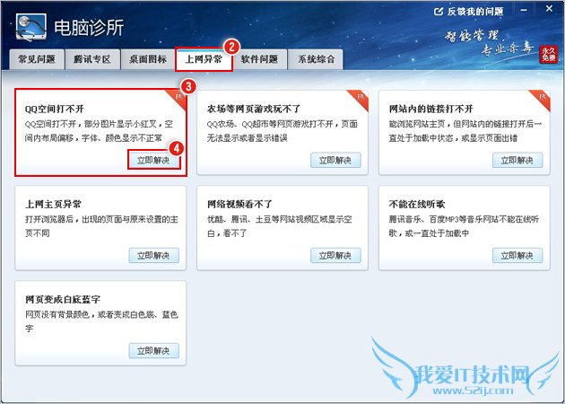 如果遇到QQ空间打不开(打开后部分模块出现小红叉,或者打开后布局偏移、颜色文字显示不正常,或者打开空间很缓慢),请使用电脑诊所“一键修复”尝试解决您的问题,操作方法如下: