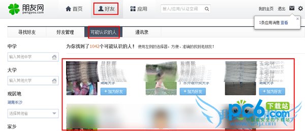 在朋友网首页中,选择好友栏目,再点击人脉,这时可以看到系统为我们推荐的可能认识的好友列表,找到想添加的好友添加即可