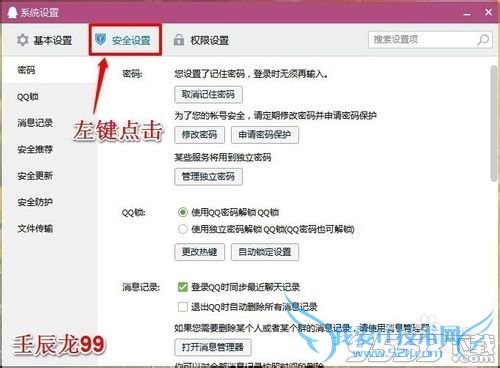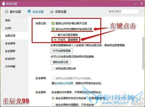 4、在安全设置窗口,我们找到:消息记录,并左键点击:退出QQ时自动删除所有消息记录和不询问,直接删除;