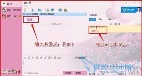 5、下面我们来试试,在一个聊天窗口输入并发送:你好!,这时聊天窗口和消息记录中都出现了“你好!”的信息;