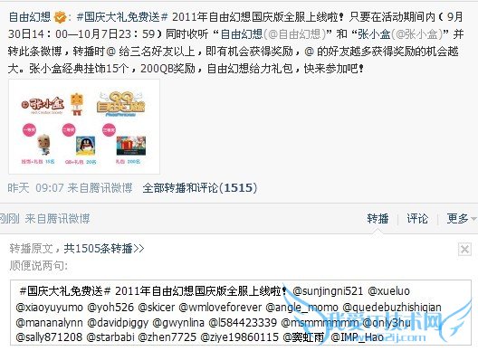 有玩家要问小记了,是不是转播任意内容都可以呢?当然不行了,既然是十一活动,我们怎么能跑掉这个主题?官方指定转播内容为:“#国庆大礼免费送#2011年自由幻想国庆版全服上线啦!”只要在活动期间内(9月30日14:00—10月7日23:59)同时收听“自由幻想”和“@张小盒”并转此条微博,转播时@给三名好友以上,即有机会获得奖励,@的好友越多获得奖励的机会越大,相信你的运气,下个礼包属于你!