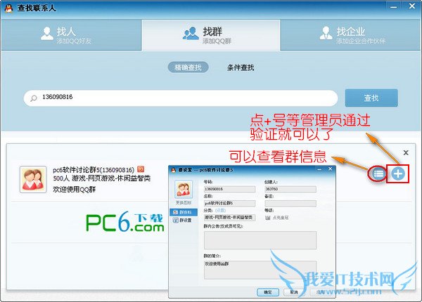 3.输入qq群号点查找后就会出现群的简要信息,点右边的+号等管理员通过验证即可,另外还可以点+号前面的标志来查看群的信息。